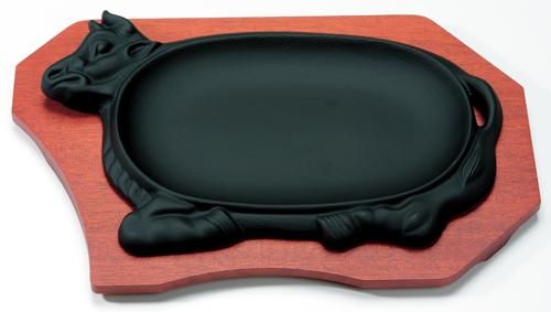 牛をかたどったステーキ皿です。冷めにくい鉄鋳物のプレートだから、料理をアツアツのまま楽しめます。木台付、IH対応。対応ハンドルなし。